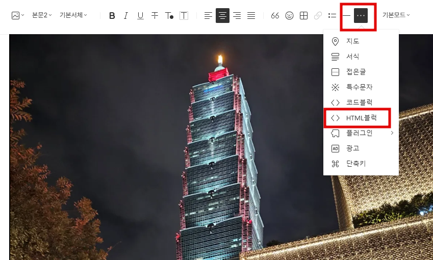티스토리의 더보기에 들어가서 < >HTML 블럭을 클릭합니다.