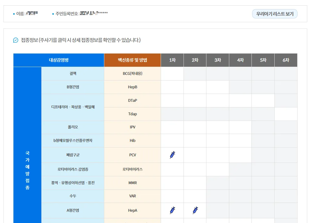 아이들의 성장시기에 맞춰 국가예방 접종했다면 접종정보가 모두 보여집니다.