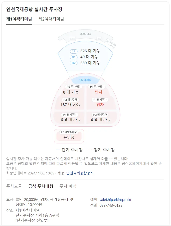 인천공항 홈페이지를 검색하면 실시간으로 주차장 현황을 볼 수 있습니다. 실시간 주차 가능 대수는 업데이트 시간차로 약간의 차이가 있을 수 있지만 참고적으로 보기에 편리합니다.